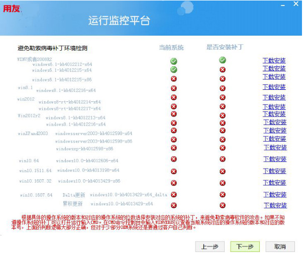 為了協(xié)助客戶(hù)預防和規避勒索病毒帶來(lái)的危害,U8產(chǎn)品研發(fā)部門(mén)快速開(kāi)發(fā)了勒索病毒安全補丁檢查工具,通過(guò)工具,客戶(hù)可以了解自己服務(wù)器缺少哪些勒索病毒相關(guān)補丁,也可以在線(xiàn)下載安裝所需補丁,確保服務(wù)器安全。