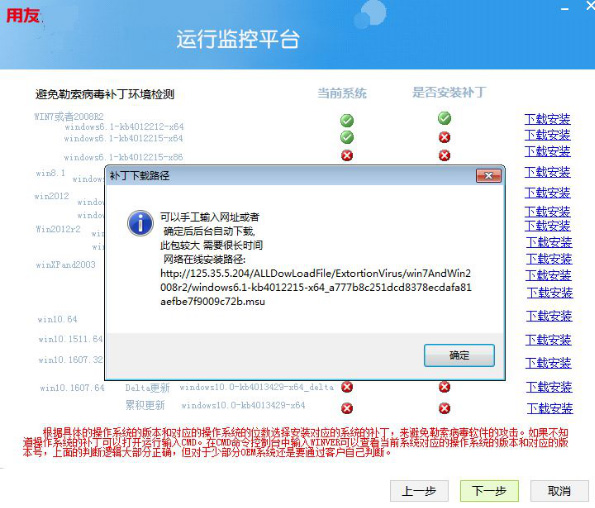 系統會(huì )彈出提示,告知下載耗時(shí)以及可以手工到對應地址下載安裝,點(diǎn)擊“確定”系統開(kāi)始下載及安裝相關(guān)補丁。